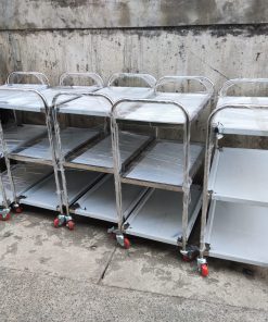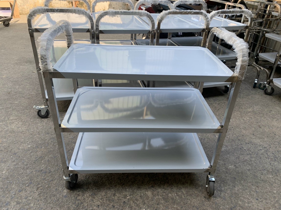 Xe đẩy inox 3 tầng dùng trong bệnh viện, trạm xá, phòng khám chữa bệnh hoạc dùng đẩy thức ăn trong Nhà hàng, khách sạn, quán ăn. Hàng sản xuất gia công bán sẵn tại Inox Nam Việt.